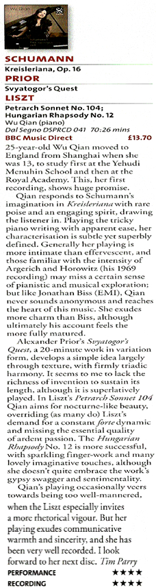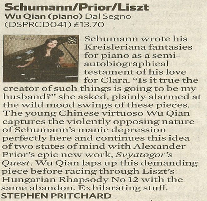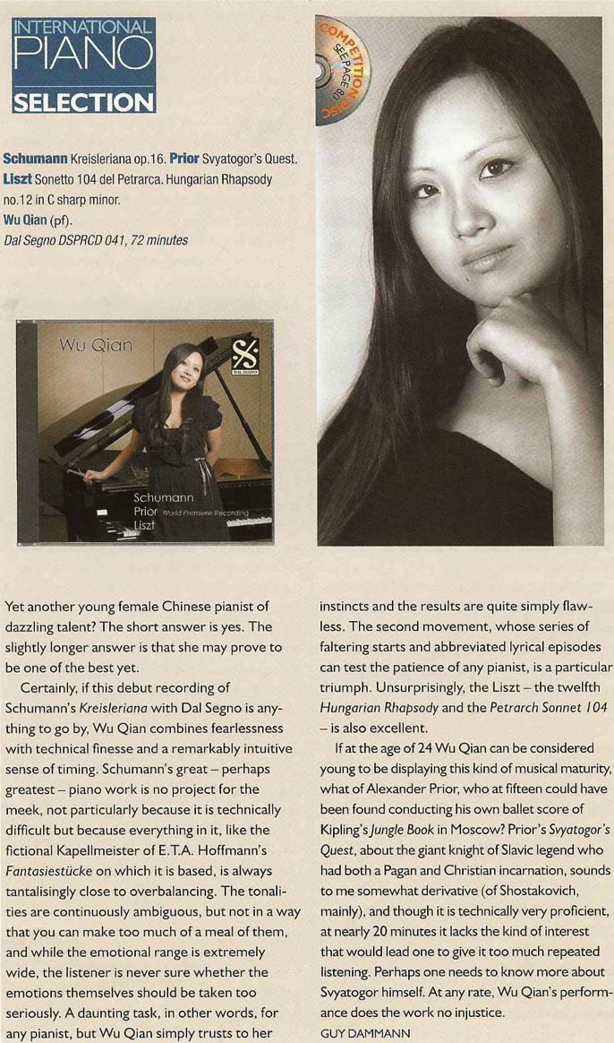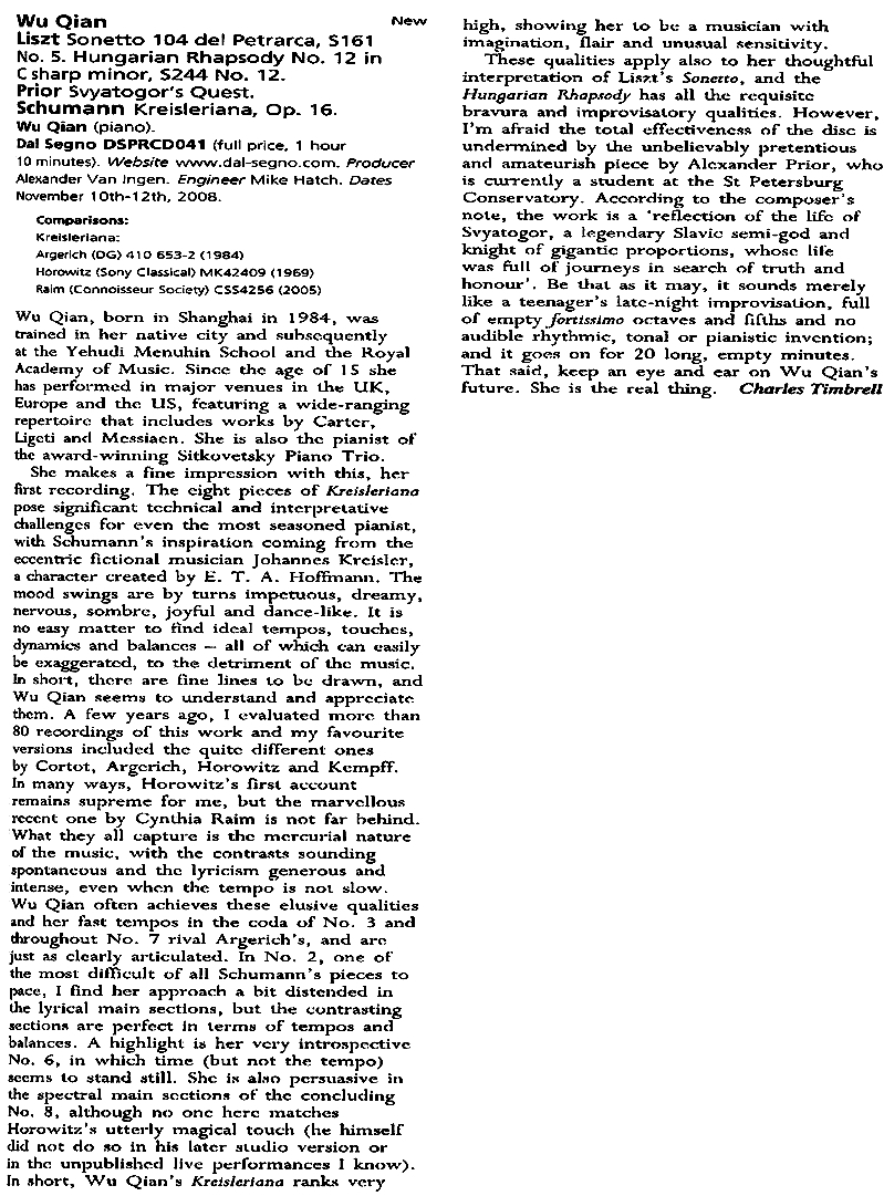 So check them out and make your own comparison: "Yuja Wang: Chopin, Scriabin, Liszt, Ligeti" (Deutsche Grammophon), and "Wu Qian: Schumann, Prior, Liszt" (Dal Segno). This latter would have been a perfect Cd, had Wu Qian not misguidedly invited the 16-year-old Alex Prior - a boy making waves at the moment - to contribute a piece: his 20 pretentious and leaden minutes fatally drag down her lovely work with Kreisleriana and Petrarch Sonnet No 104. (By all means include a new young composer to leaven the greats: just make sure their music can cut it.)