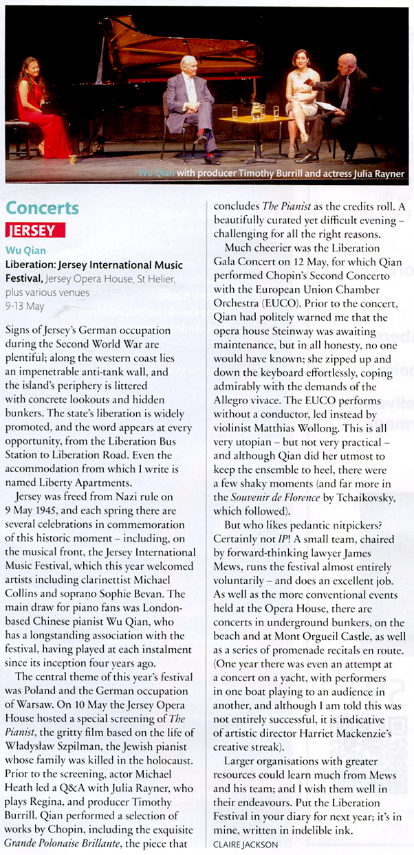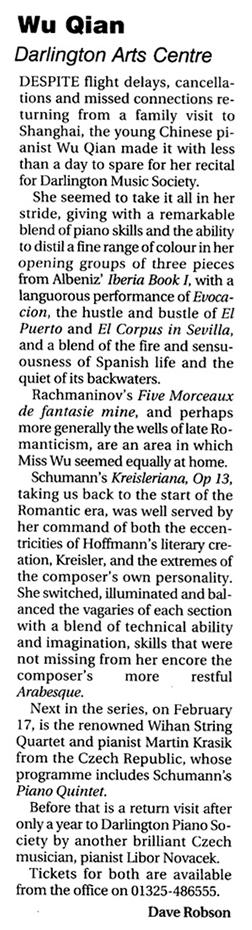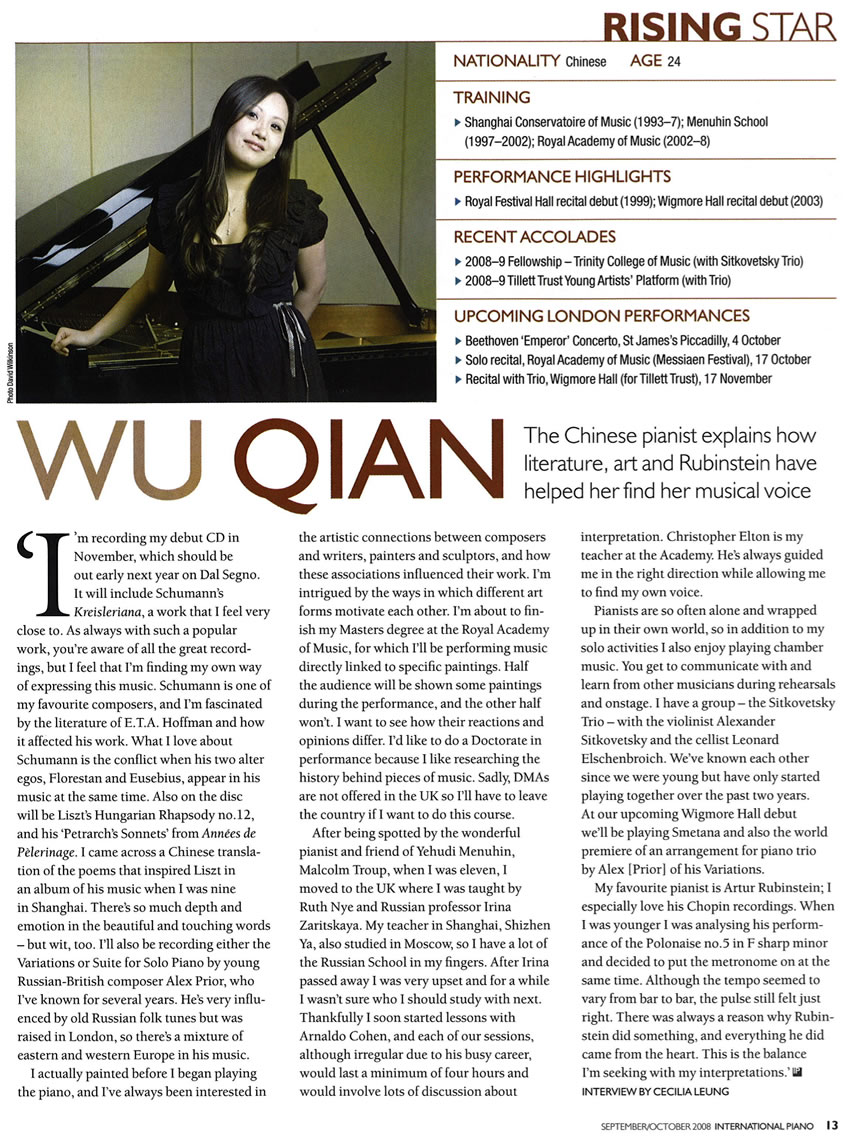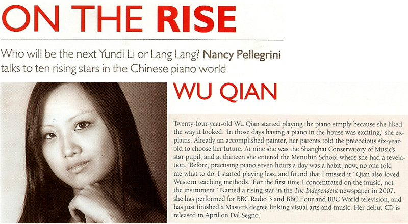 “Wu Qian is surely destined for stardom….She mixed deep colours in Elliot Carter’s Night Fantasies but played nothing more heart-stoppingly exciting than Hallgrimson’s Victory Boogie-Woogie.”