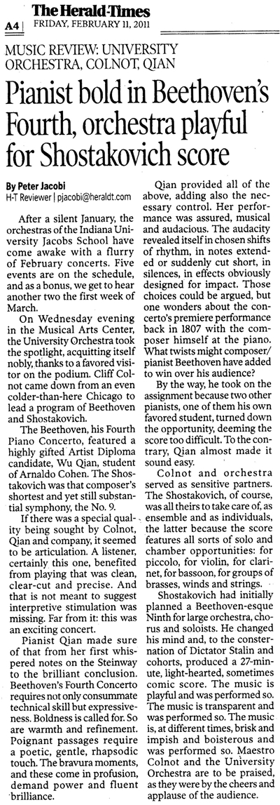“Qian’s performance (of Elliott Carter’s Night Fantasies) transcended the work’s extraordinary difficulties, illuminating the poetry of Carter’s vision with laser-like clarity. Throughout her performance there was an unmistakable sense of a personal, emotional involvement with the music, revealing astonishing musical maturity.”